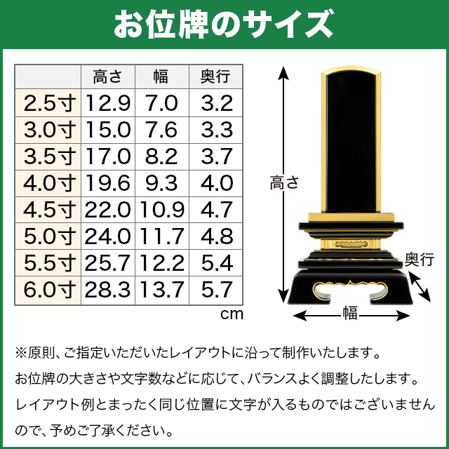 2.5寸:高さ12.9×幅7.0×奥行3.2cm 3.0寸:高さ15.0×幅7.6×奥行3.3cm 3.5寸:高さ17.0×幅8.2×奥行3.7cm 4.0寸:高さ19.6×幅9.3×奥行4.0cm 4.5寸:高さ22.0×幅10.9×奥行4.7cm 5.0寸:高さ24.0×幅11.7×奥行4.8cm 5.5寸:高さ25.7×幅12.2×奥行5.4cm 6.0寸:高さ28.3×幅13.7×奥行5.7cm |