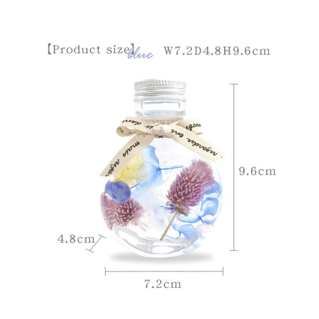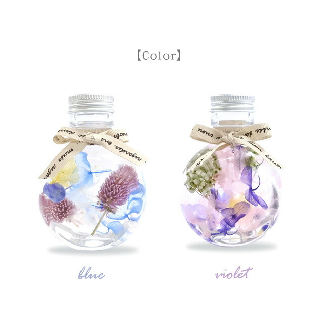 ハーバリウムは天然素材の植物をボトルに入れ、専用のオイルに浸したものです。 花の美しい色合いや、素材の組み合わせによるデザインをそのままに楽しめるインテリアフラワーです。