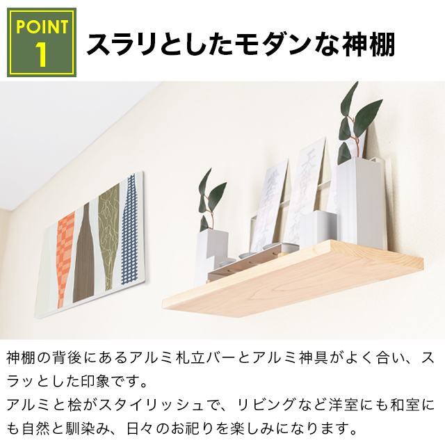アルミと桧がスタイリッシュで、リビングなど洋室にも和室にも自然と馴染み、日々のお祀りを楽しみになります。