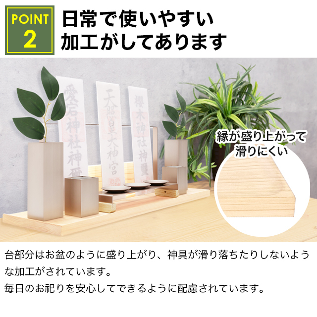 縁が盛り上がった台は神具の落下を防ぎ、安心してお使いいただけます。