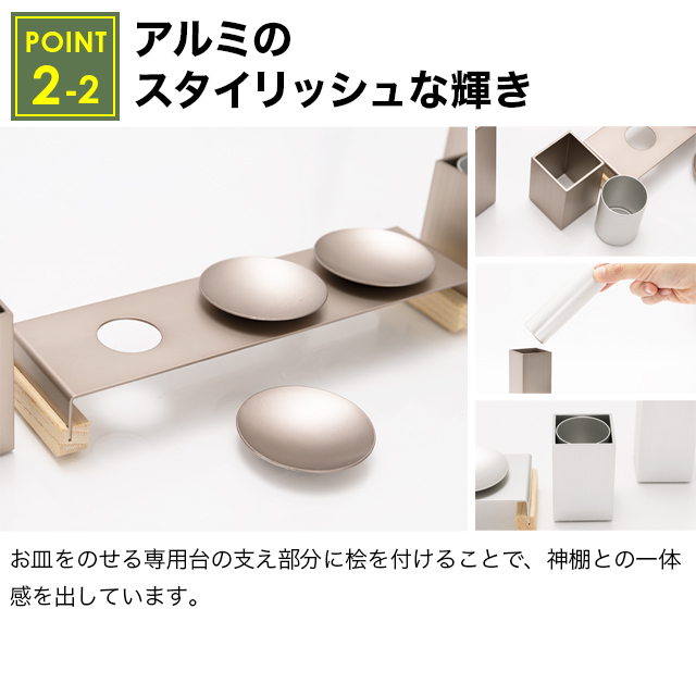 神棚と神具にもアルミが使われ、一体感がありスタイリッシュな印象でお部屋を飾ります。こちらのアルミにはアルマイト(陽極酸化皮膜)を使い傷や腐食から守り、永くお使いいただけます。