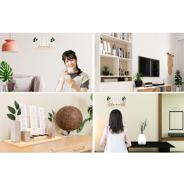 瓶子や榊立ては取り外し可能な二重構造でお手入れも簡単。美しさと機能性を兼ね備えた、新しい形の神棚です。