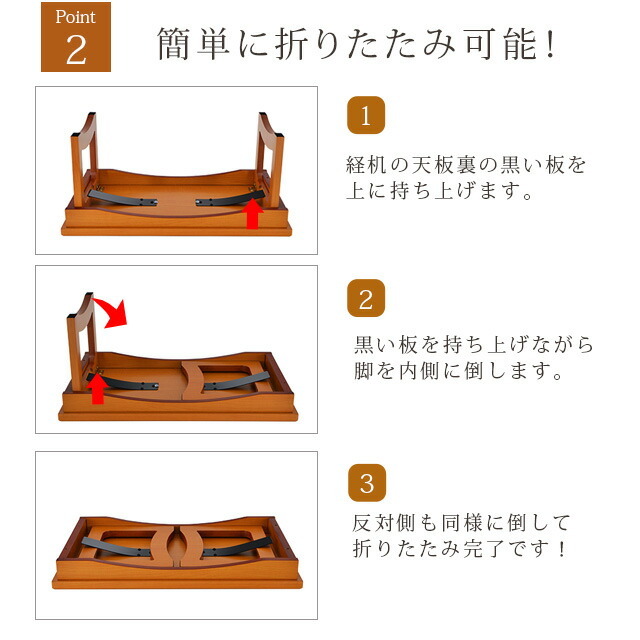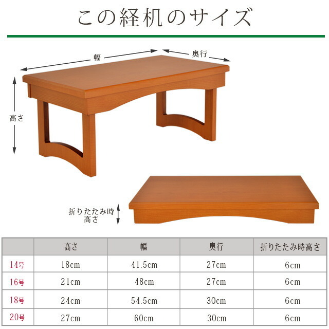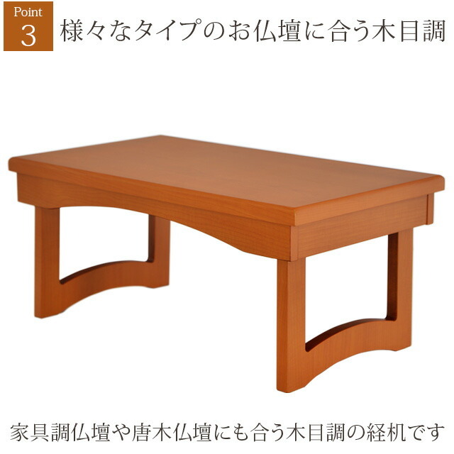 お仏壇の前に置く経机として、また花台としてもご利用いただけます。 経机を使用することで座った状態でおまいりが可能です。 ぐらつきがなく、安定しているので大切な仏具なども安心して設置いただけます。 経机として使用する場合は、 お仏壇の幅に合わせてお選びいただけます。 |