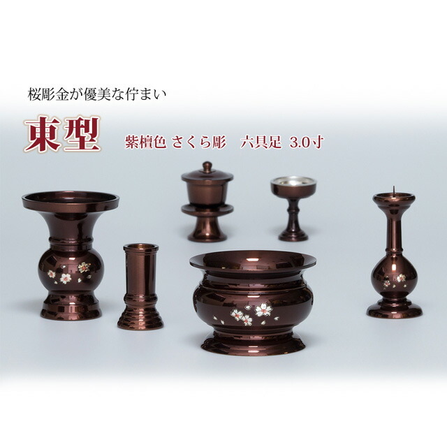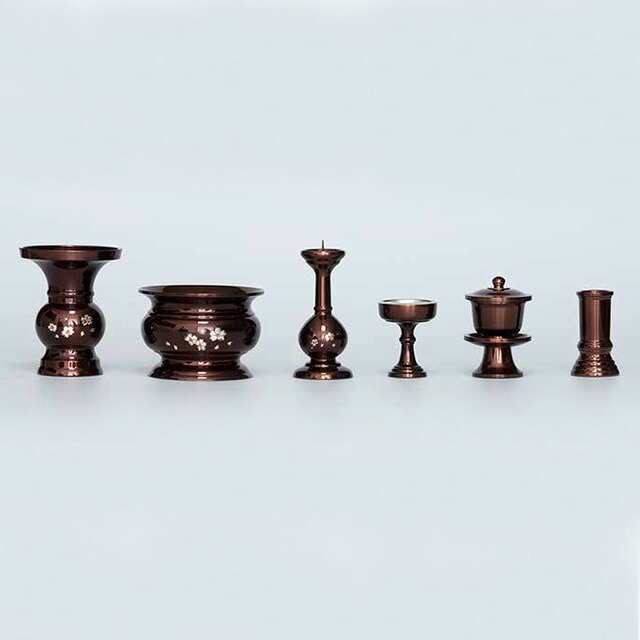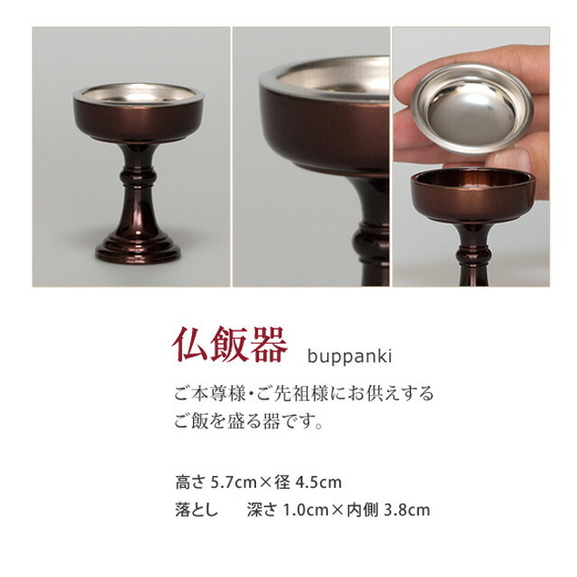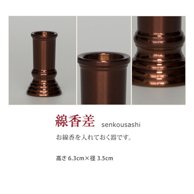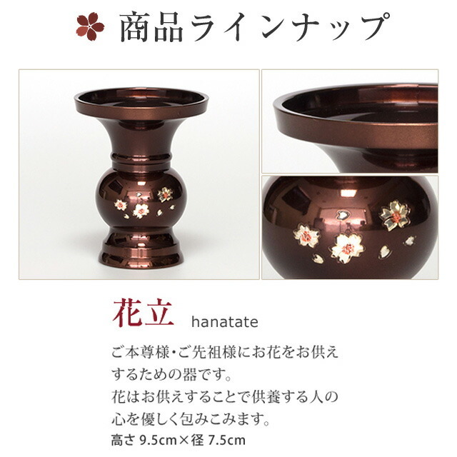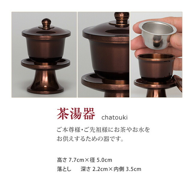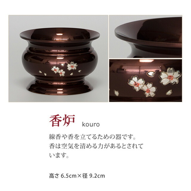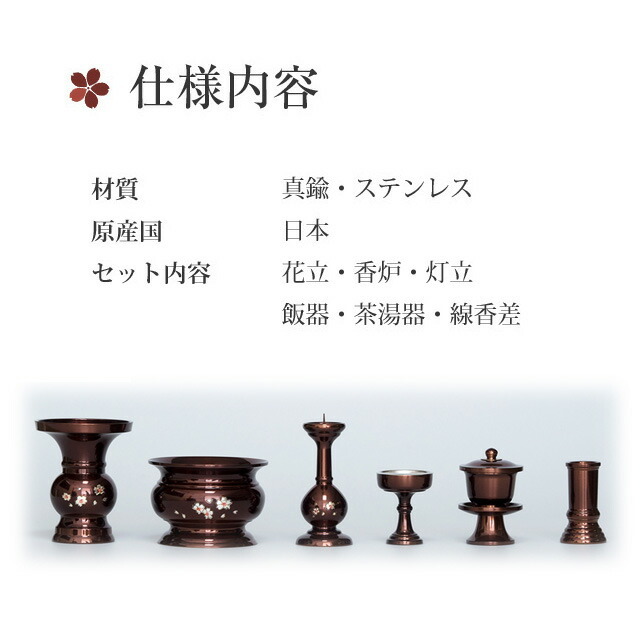 茶器 高さ7.7cm×径5.0cm 仏器 高さ5.7cm×径4.5cm 花立 高さ9.5cm×径7.5cm 香炉 高さ6.5cm×径9.2cm 灯立 高さ9.4cm×径7.5cm 線香差し 高さ6.3cm×幅3.5cm |