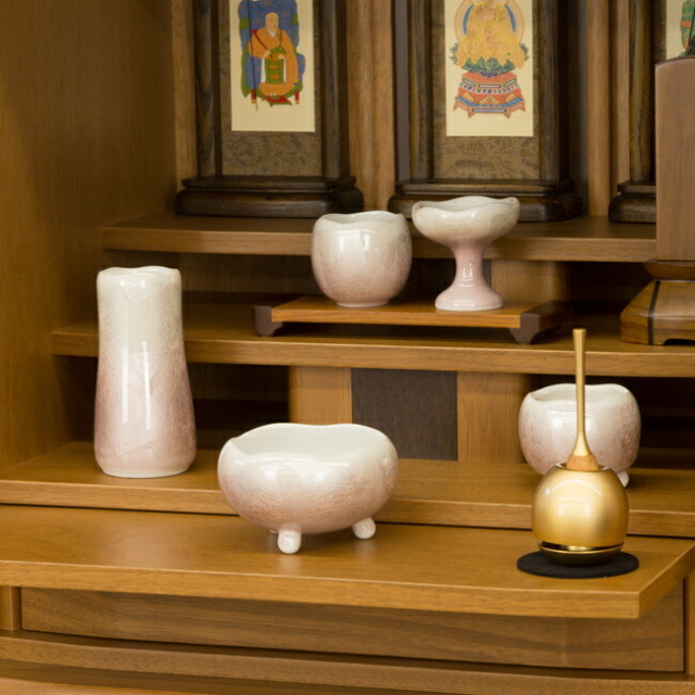ほのかシリーズの仏具は丸みを帯び、淡いピンクとホワイトのコントラストが お仏壇内を優しく柔らかい印象を与えます。
