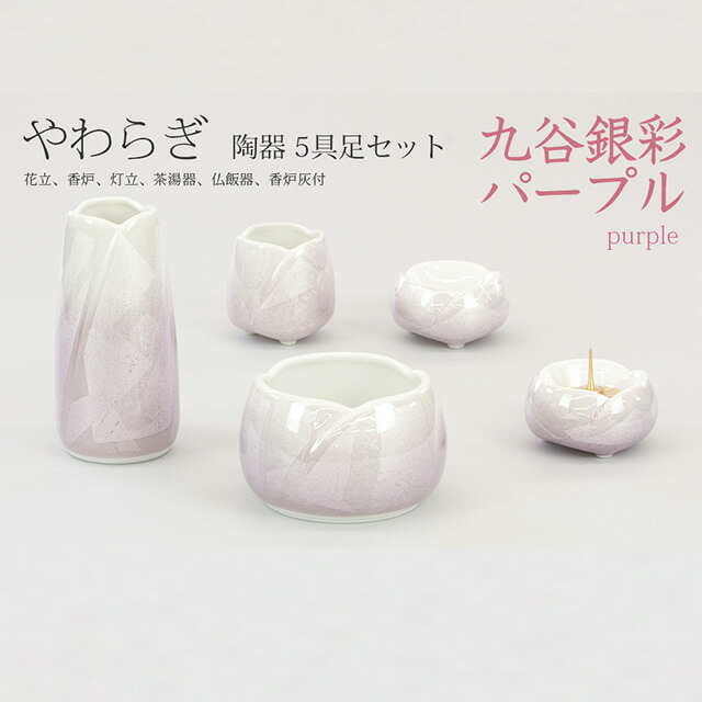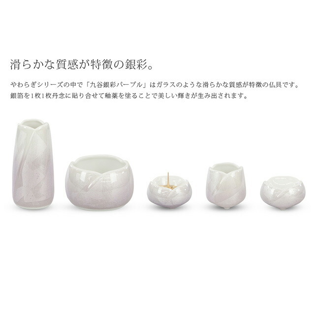 やわらぎシリーズの中で「九谷銀彩パープル」はガラスのような滑らかな質感が特徴の仏具です。