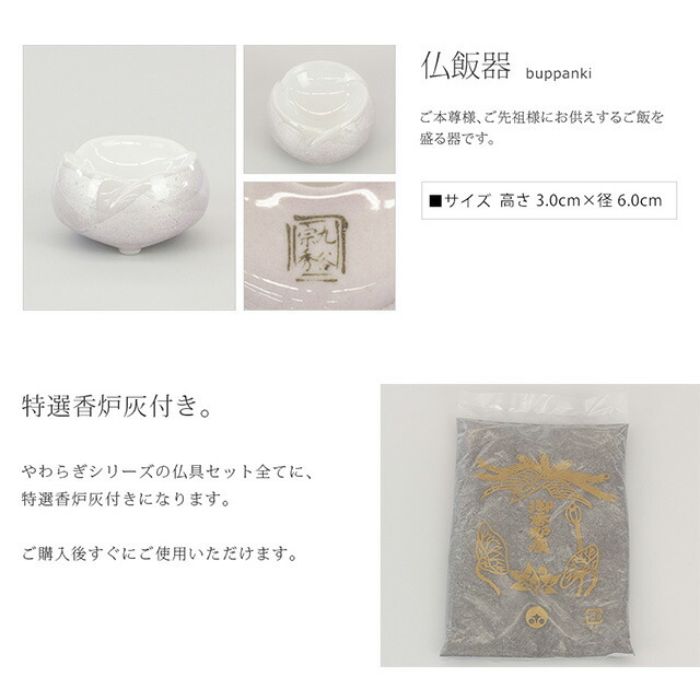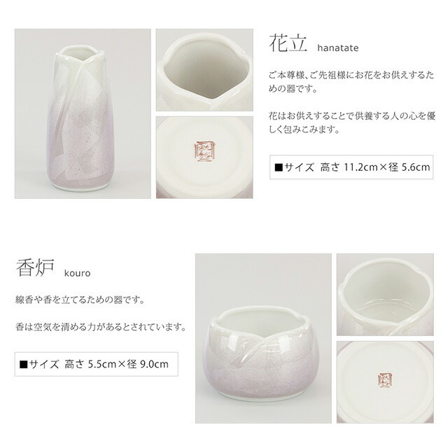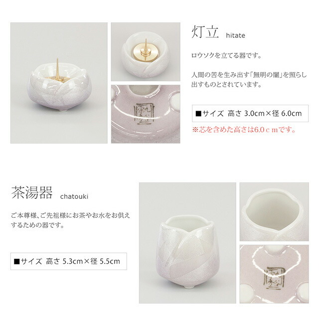 ■花 立:高さ11.2cm×径5.6cm ■香 炉:高さ5.5cm×径9.0cm ■灯 立:高さ6.0cm×径6.0cm (灯立の芯がない高さは3.0cmになります) ■茶湯器:高さ5.3cm×径5.5cm ■仏飯器:高さ3.0cm×径6.0cm |