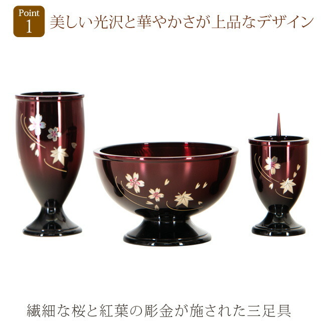 三具足と呼ばれる花立・香炉・灯立に桜と紅葉の彫金を施しました。全てに入れるのではなく、特に大事な三具足に施すことにより、メリハリがつき、お仏壇を上品に彩ります。
