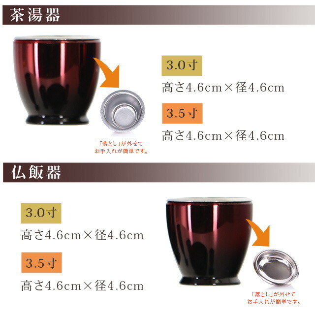茶湯器と仏飯器は、銀色のお皿のような「落とし」がついています。ご飯やお水の水気による腐食から仏具を防ぐため、必要な物です。「落とし」は外して洗えるため、お仏具を濡らすことなく、お手入れすることができます。