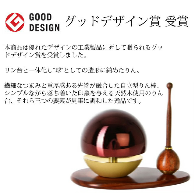 たまゆらりんは優れたデザインの工業製品に対して送られるグットデザイン賞を受賞しました。りん台と一体化し“球”としての造形に納めたりん、繊細なつまみと重量感ある先端が融合した自立型りん棒、シンプルながら落ち着いた印象を与える天然木使用のりん台、それら三つの要素が見事に調和した逸品です。